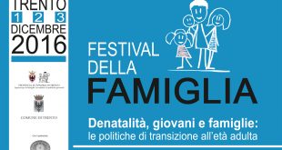 01 – 03 Dicembre 2016 TRENTO Festival della famiglia 2016 Pubblicato il programma della quinta edizione del Festival della famiglia dedicato a “Denatalità, giovani e famiglia. Le politiche di transizione all’età adulta”. Le giornate dall’1 al 3 dicembre 2016 vedranno protagonisti i giovani, le istituzioni e le famiglie. Le tre …