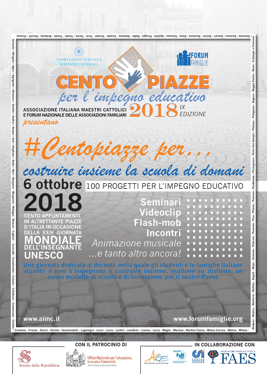 Torna sabato 6 ottobre la IX edizione di Centopiazze, storica iniziativa promossa dall’AIMC, l’Associazione Italiana Maestri Cattolici e per la prima volta, quest’anno, in collaborazione con il Forum delle Associazioni familiari.
